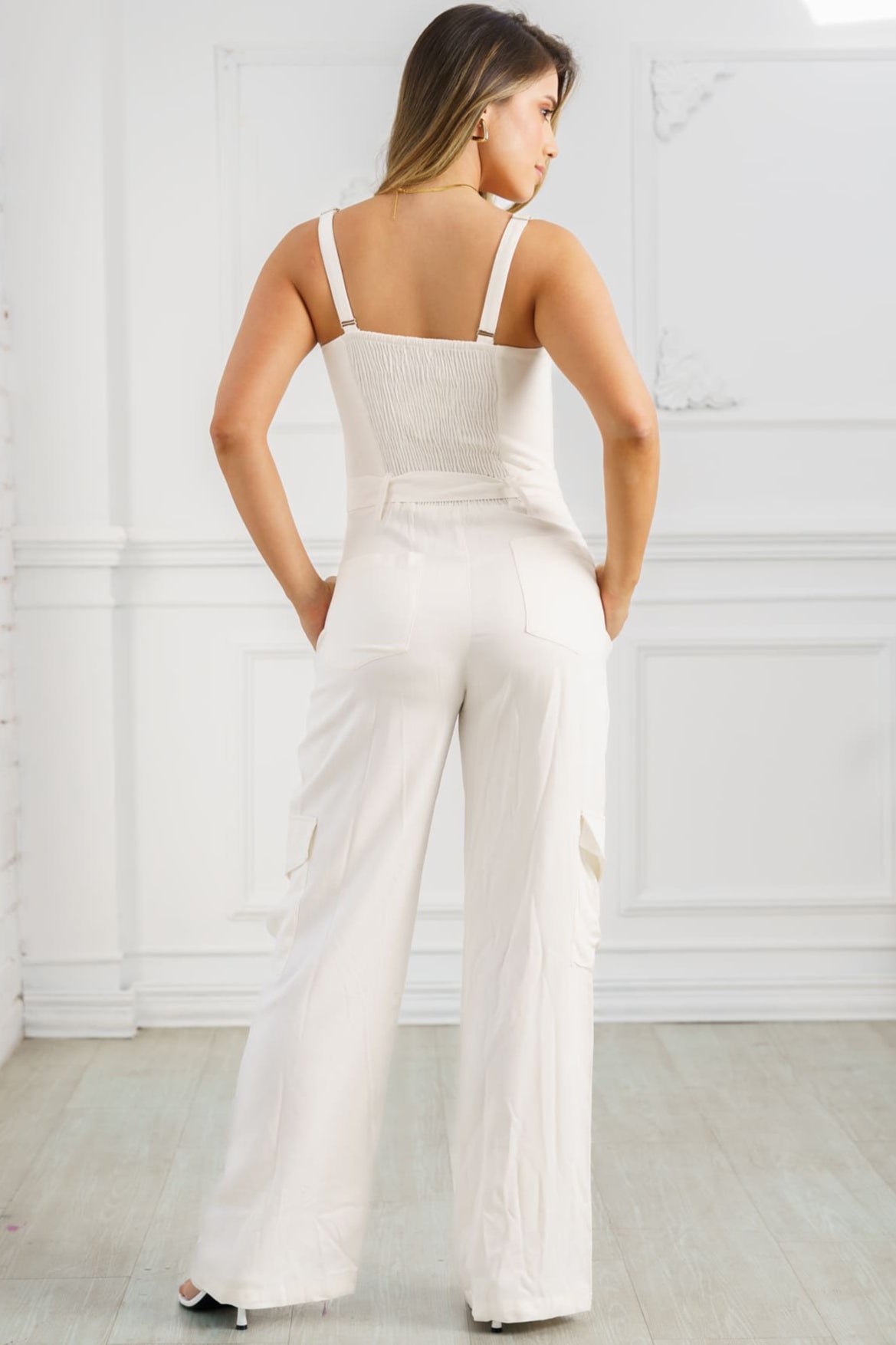Un básico infaltable con un toque moderno. Este enterizo tipo cargo en tono blanco es una prenda versátil, elegante y cómoda que realza tu silueta con un diseño limpio y femenino. Presenta escote recto, tirantes anchos, bolsillos laterales tipo cargo y un cinturón con hebilla decorativa que define la cintura de manera sutil. Su confección en tela ligera y fresca lo hace ideal para climas cálidos o para llevar con estilo durante todo el año. Perfecto para combinar con tacones, sandalias o zapatillas para un look casual o más sofisticado.