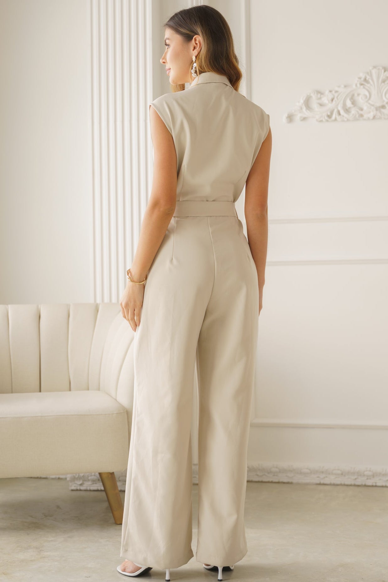 Cuenta con escote en V y cuello solapa, que estilizan el cuello y el torso. Su cinturón ajustable define la cintura y realza la silueta, mientras el pantalón de pierna amplia brinda comodidad y una caída fluida. Además, incluye bolsillos laterales, sumando funcionalidad al diseño.