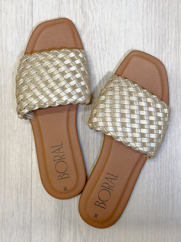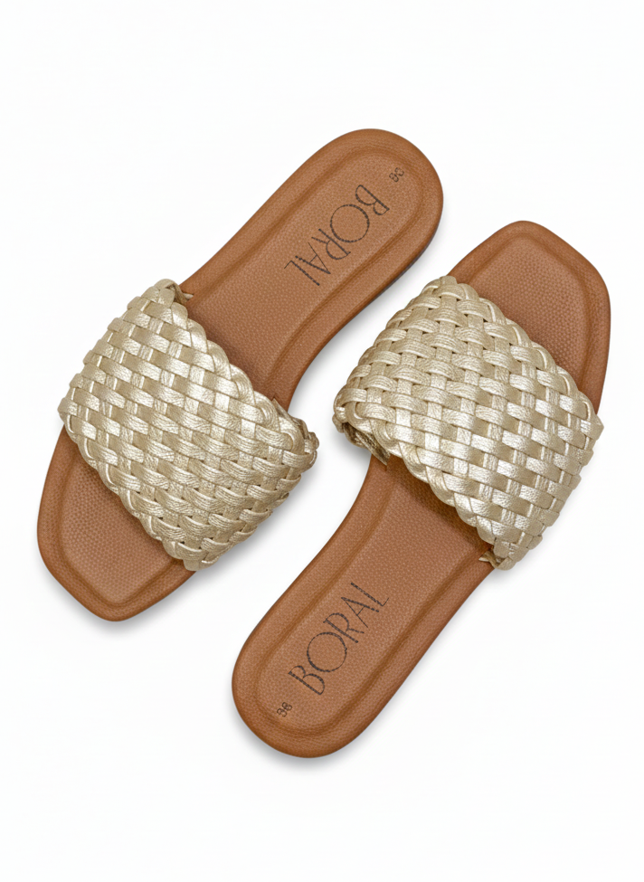 Sandalias planas con diseño moderno y femenino. Cuentan con una capellada ancha tejida en tono dorado champagne, que aporta brillo sutil y un acabado elegante. Su suela es cómoda, liviana y en tono cuero, ideal para uso diario. Tienen punta cuadrada, un detalle que estiliza y les da un toque contemporáneo.
