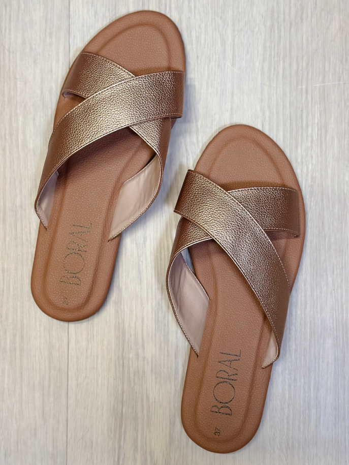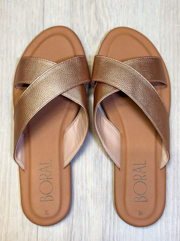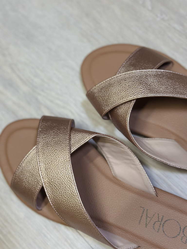 Sandalias Planas Cruzadas Boral: Brillo Bronce y Máximo Confort