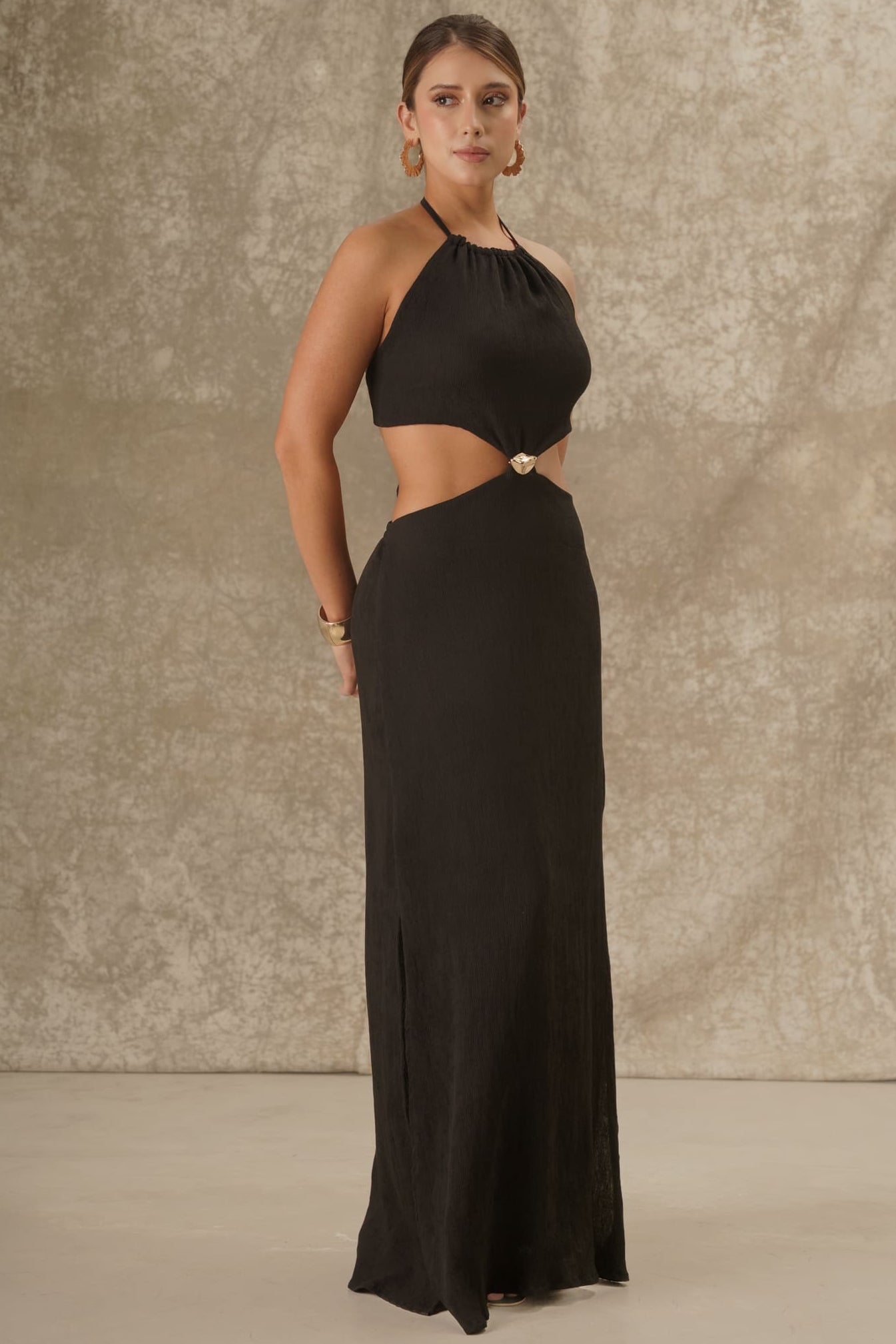 Un diseño sofisticado y moderno que resalta la figura con elegancia. El vestido Gaza cuenta con un escote halter fruncido que realza los hombros y el cuello, acompañado de cut outs laterales que definen la cintura y añaden un toque atrevido. En el centro, un adorno dorado une el top y la falda, aportando un detalle glamuroso. Su abertura lateral en la falda brinda movimiento y sensualidad en cada paso.
