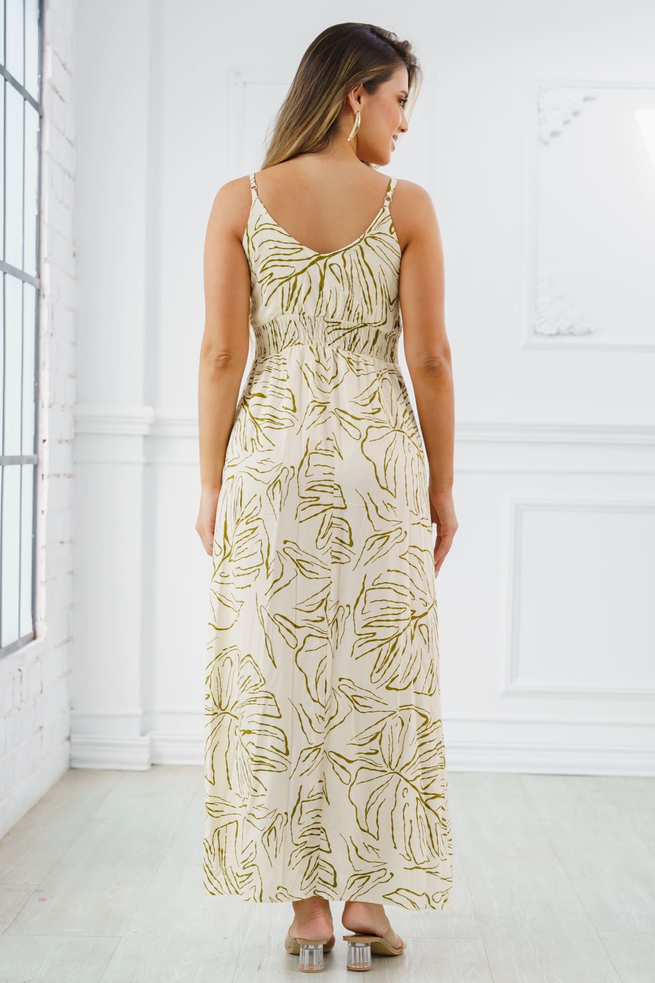 Sumérgete en la elegancia effortless con nuestro vestido maxi asimétrico, una pieza imprescindible para tu guardarropa de clima cálido. Este hermoso vestido presenta un delicado estampado de hojas estilizadas en un suave tono verde oliva sobre un fondo blanco roto, evocando una sensación de tranquilidad y conexión con la naturaleza.